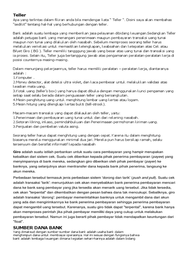 Definisi teller • teller adalah petugas bank yang bekerja di front line banking hall dan melakukan transaksi langsung dengan nasabah dalam bentuk penerimaan/penarikan, baik.
